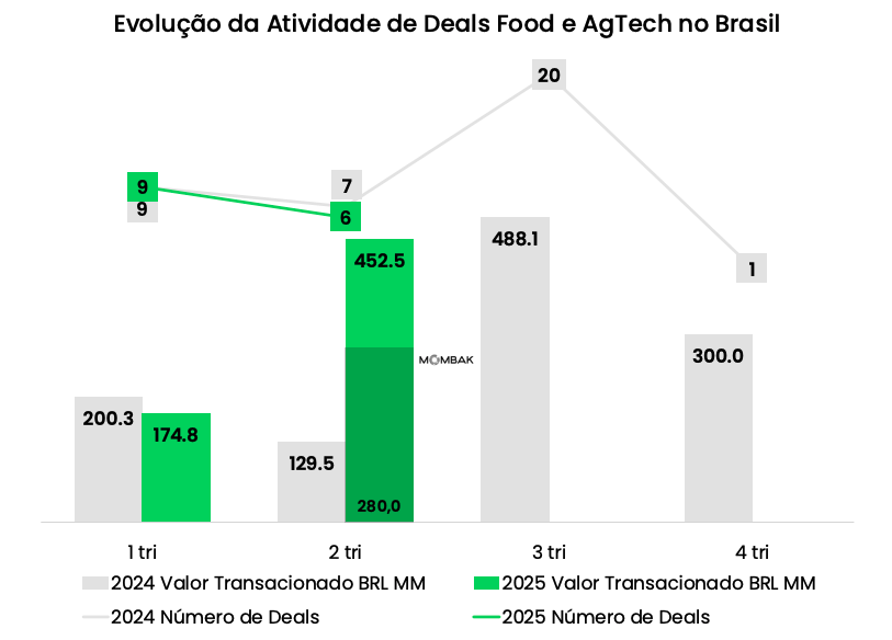 O grande destaque foi o aporte de R$ 280 milhões na Mombak, ClimateTech dedicada à regeneração florestal e créditos de carbono de alta integridade. Outros movimentos relevantes incluíram o fortalecimento de AgFinTechs como a Agrolend, marketplaces como a Grão Direto e soluções de agricultura digital como a Checkplant.